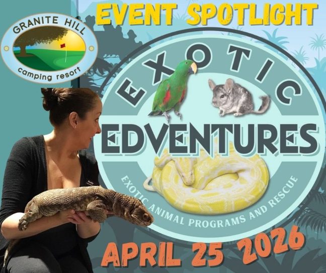Join in the Virtual Dino Egg Hunt, gather for ghost stories after dark, and enjoy a weekend packed with games, crafts, and family fun. Keep your eyes peeled — if you find the Golden Dino Egg, you could win a free weekend of camping in 2026! Don’t miss the Exotic Edventures Exhibit, where real reptiles and fascinating creatures bring the prehistoric world to life.From curious kids to grown-up dino fans, there’s something for everyone at Granite Hill’s Prehistoric Weekend — it’s going to be a roaring good time!